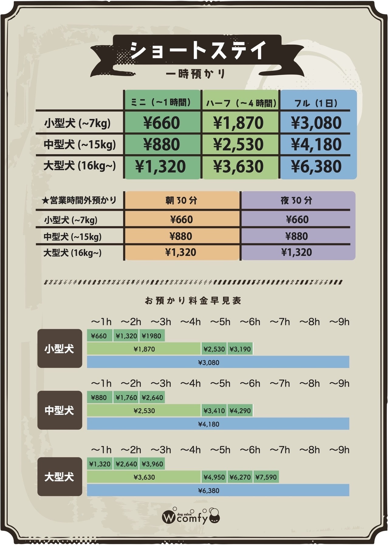ミニ(1時間)、ハーフ(4時間)、フル(1日 10:00〜19:00)のコースをご用意しております。シャンプー・トリミングとも併せてご利用いただけますのでさまざまなシーンで飼い主さまのご予定に合わせてご相談ください。